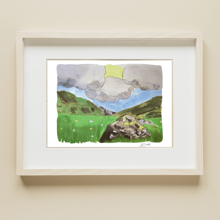 Originally featured on our evocative Highland Rains candle, this hand-painted illustration captures the misty romance of a Scottish downpour. Layers of soft grays and cool, rain-washed greens echo windswept hills and quiet glens, bringing a sense of calm adventure to any room. Hang it in your home, office, or reading nook to enjoy the tranquil beauty of the Highlands—no umbrella required.